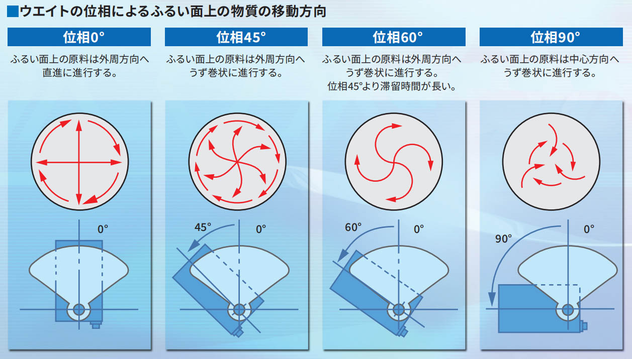そして、振動(dòng)體に上下のウエイトをつけることで、水平·垂直·斜めの動(dòng)きの3次元運(yùn)動(dòng)が可能になり原料の性質(zhì)に合わせた処理ができます。